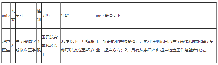 因业务发展需要,面向社会招聘2名编外超声医生,现将相关信息公布如下: