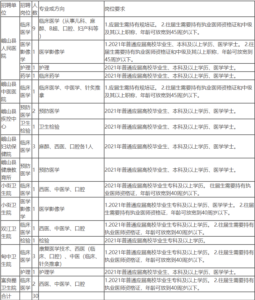 热爱医疗卫生事业,遵纪守法,品行端正;毕业时须取得专业对应的毕业证、学位证、县医院和中医院的临床岗位还需有规培证、执业医师资格证;具有岗位所需要的专业知识和技能;所学专业或方向与招聘岗位要求相符或相近;