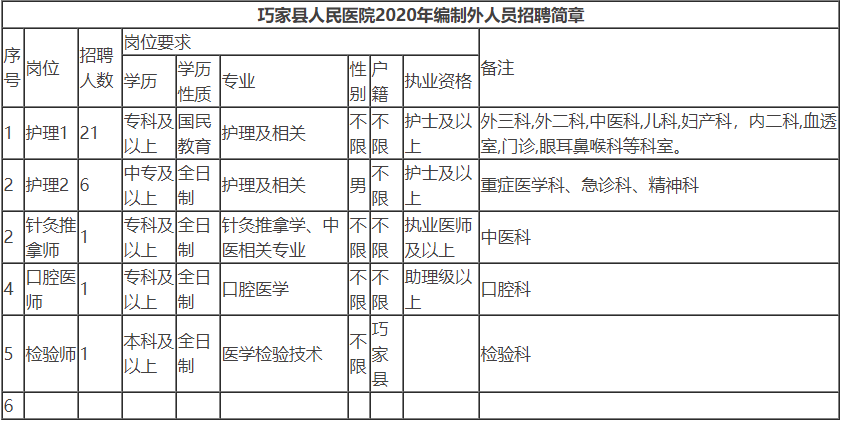 6、具备拟报考岗位所要求的其他资格条件,具体职位要求详见《巧家县人民医院2020年编制外人员招聘简章》