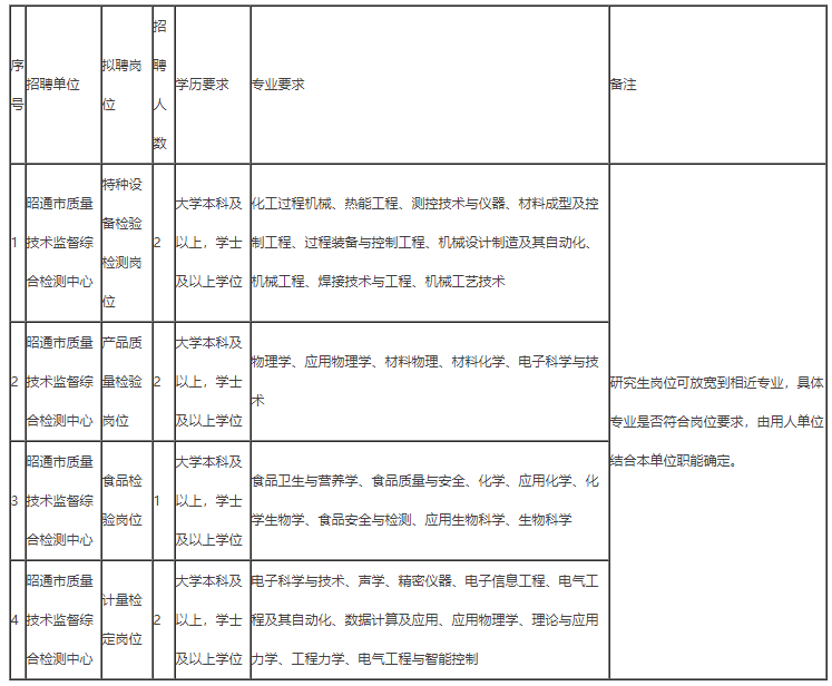 (一)招聘岗位及职数。特种设备检验检测岗位2名,产品质量检验岗位2名,食品检验岗位1名,计量检定岗位2名,共计7名(招聘岗位及所需专业详见《昭通市市场监督管理局所属事业单位2021年公开招聘紧缺专业人才招聘计划汇总表》)。