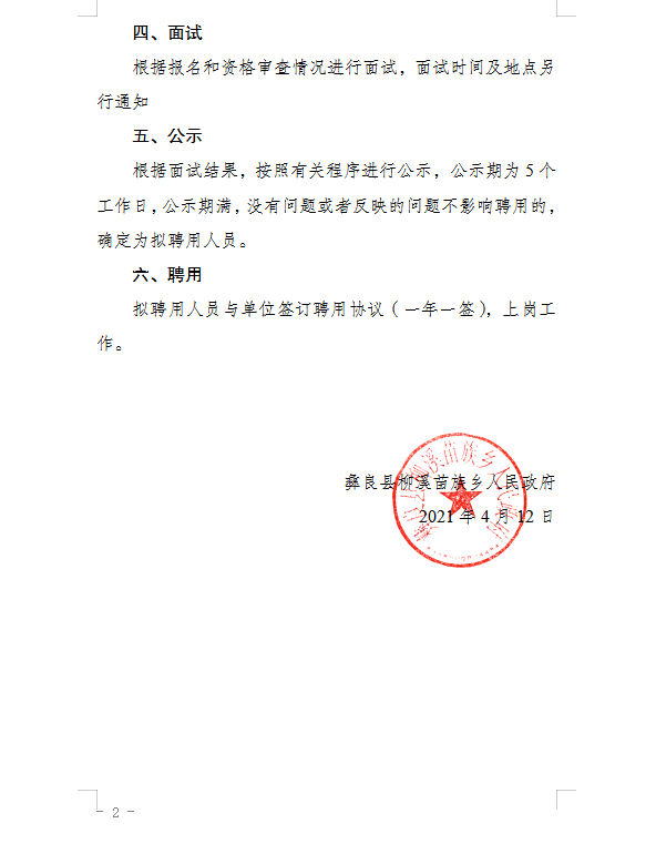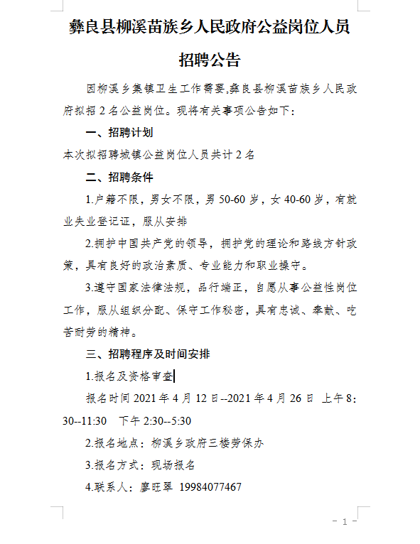 昭通市彝良县柳溪苗族乡人民政府2021年公益岗位招聘公告