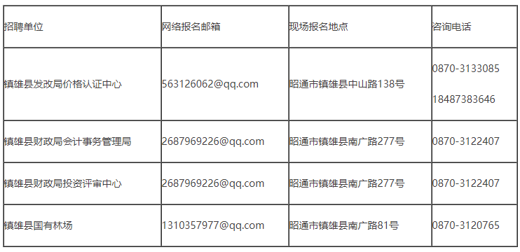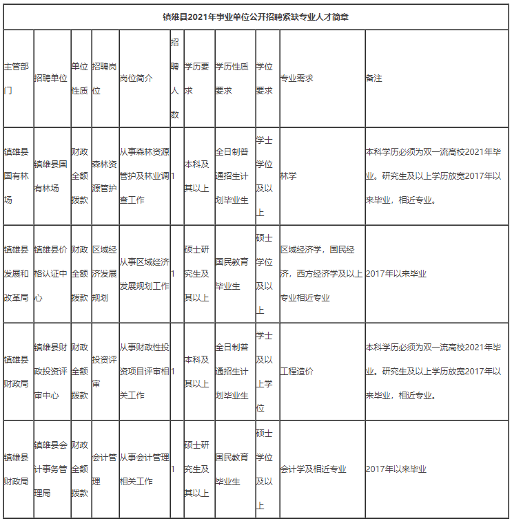 本次招聘共有4家单位计划招聘4人。其中:镇雄县价格认证中心1人;镇雄县国有林场1人;镇雄县财政投资评审中心1人;镇雄县会计事务管理局1人;具体招聘岗位及条件详见《镇雄县2021年事业单位公开招聘紧缺专业人才简章》(附件1)。